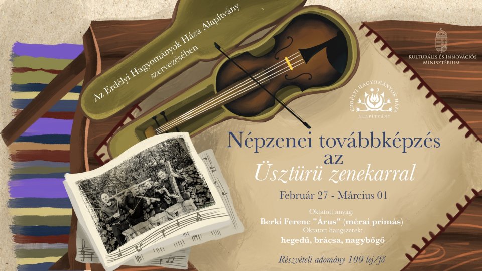 Az Erdélyi Hagyományok Háza nagyváradi területi irodája szeretettel vár minden középhaladó vagy haladó szinten játszó népzenét tanuló fiatalt és érdeklődőt egy háromnapos intenzív népzenei továbbképzésre, amelyet az Üsztürü zenekar tapasztalt muzsikusai vezetnek. A képzésen kalotaszegi népzenét tanulhatnak a résztvevők Antal Ferenc "Öreg Árus" dallamai nyomán. Helyszínek: szombat: Csillagocska Alapítvány. Péntek és vasárnap: Martin Folk Center (Moscovei u. 12.)