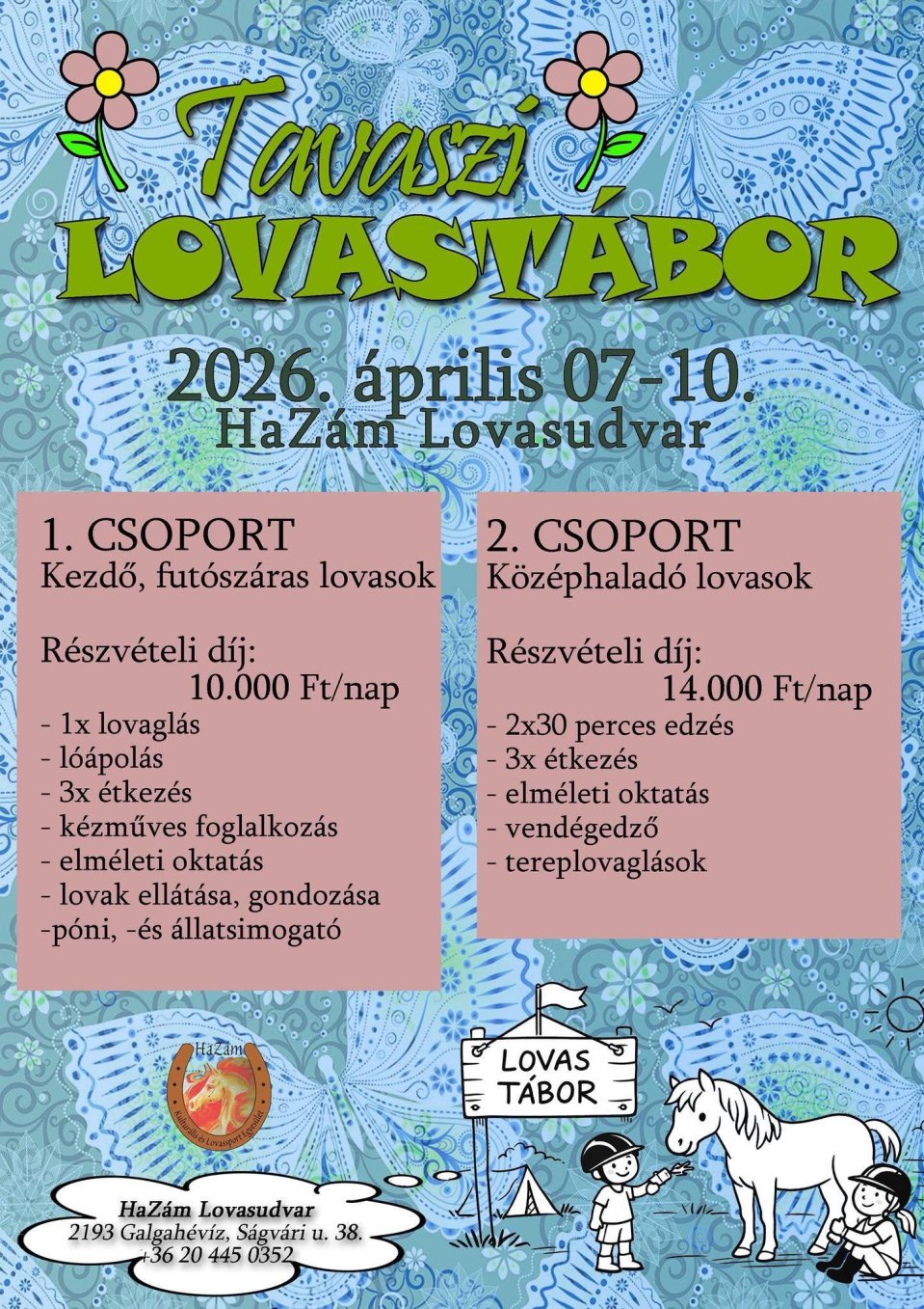 1. Csoport – Kezdő, futószárás lovasok - Részvételi díj: 10 000 Ft/nap. Napi program:
